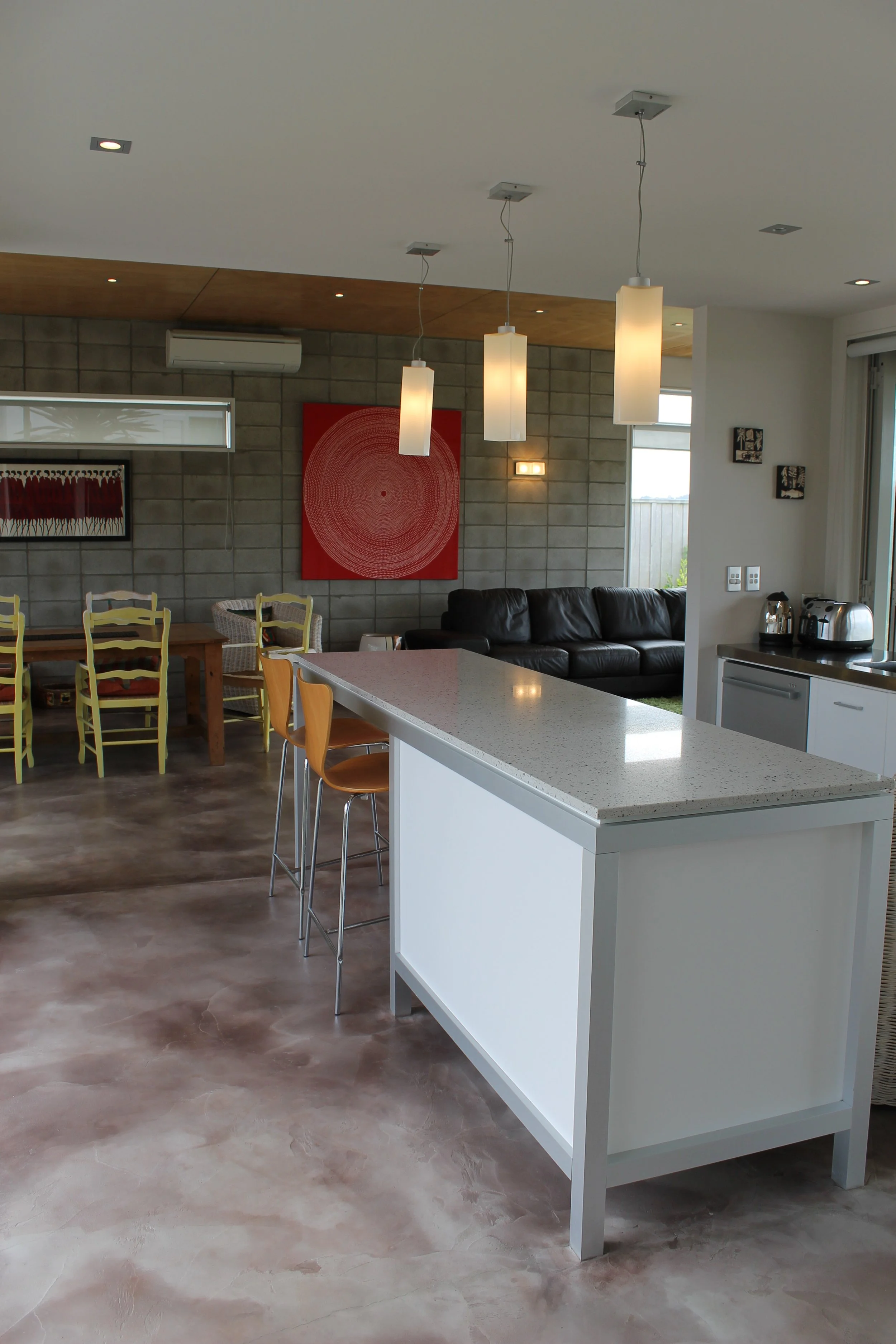 The exterior utilises a mixture of natural, low maintenance cladding materials. Concrete block visually anchors the house and provide a sense of strength and permanence. This is balanced with lightweight, vertically grooved, plywood, aluminium window and door joinery and glass balustrading.