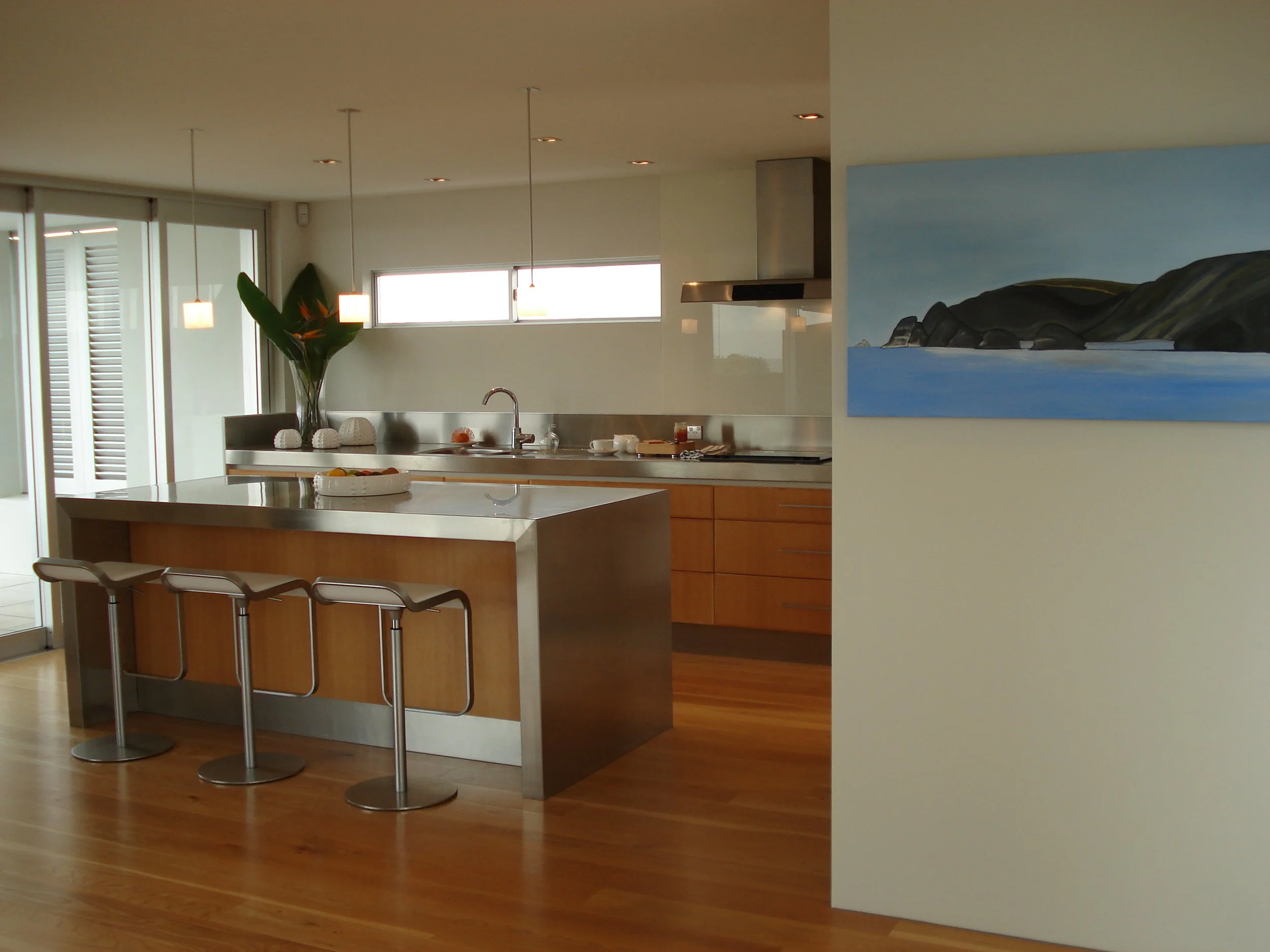 We have designed the kitchen and bathrooms to be understated and stylish yet at the same time, very practical, using a natural palette of timber veneers, stainless steel and white ceramic tiles.
